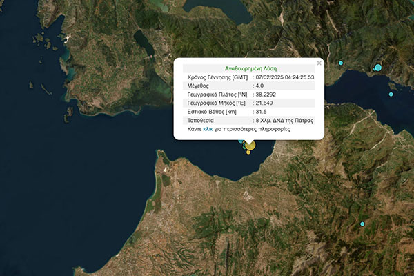 Σεισμός 4 βαθμών της κλίμακας Ρίχτερ κοντά στην Πάτρα