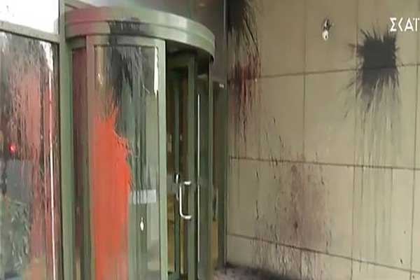 Εικόνες από την επίθεση στο Υπ. Ανάπτυξης - Αγνωστοι με μοτοσυκλέτες έριξαν μπογιές και εξαφανίστηκαν
