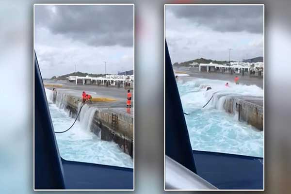 Βίντεο: Τεράστιο κύμα παρασύρει τους καβοδέτες στο λιμάνι της Τήνου