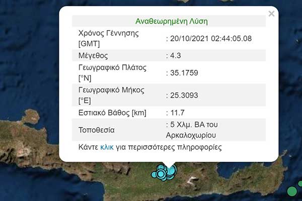 Σεισμός τώρα στην Κρήτη: Νέα δόνηση 4,3 Ρίχτερ στο Αρκαλοχώρι