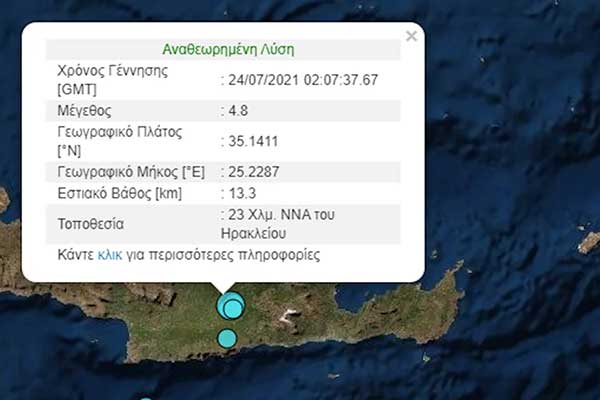 Σεισμός 4,8 Ρίχτερ στο Ηράκλειο Κρήτης -Ακολούθησαν άλλοι δύο μετασεισμοί