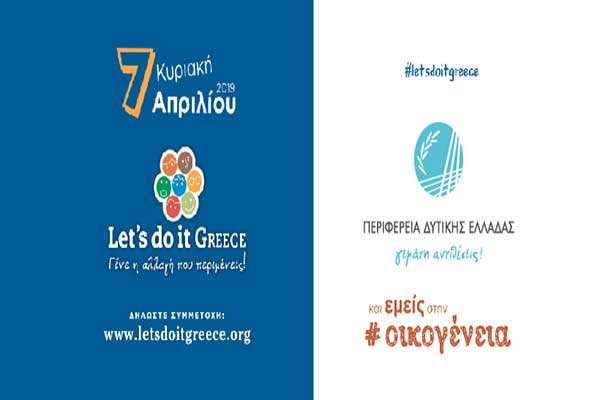 Με στόχο να ενωθεί η Ελλάδα στη Μεγαλύτερη Ταυτόχρονη Εθελοντική Δράση της χώρας, σχεδιάζονται και αυτή τη χρονιά οι δράσεις του «Let’s Do it Greece 2019», που θα πραγματοποιηθούν υπό την αιγίδα της Περιφέρειας Δυτικής Ελλάδας σε Αιτωλοακαρνανία, Αχαΐα και Ηλεία την Κυριακή 7 Απριλίου. Η φετινή εκστρατεία «Let’s Do it Greece 2019» έχει θέμα #oικογένεια και αναλαμβάνει δράση ομορφαίνοντας πλατείες, πάρκα, γειτονιές, σχολεία, ποτάμια, παραλίες, λίμνες, βυθούς, βουνά και δάση.