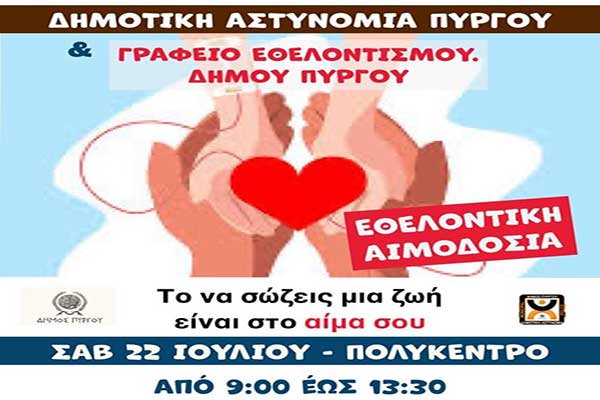Δήμος Πύργου: Εθελοντική αιμοδοσία από την Δημοτική Αστυνομία & το Γραφείο Εθελοντισμού αύριο 22/7