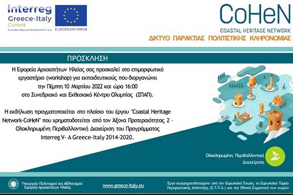 Εφορεία Αρχαιοτήτων Ηλείας: Επιμορφωτικό Εργαστήριο (Workshop) στο πλαίσιο του έργου ‘Δίκτυο Παράκτιας Πολιτιστικής Κληρονομιάς’