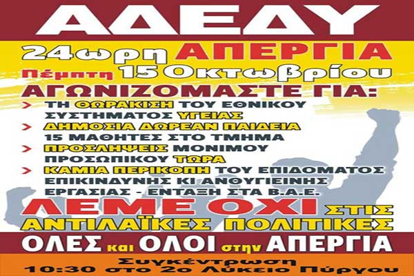 - Σύλλογος Εργαζομένων Δήμων Πύργου – Αρχ. Ολυμπίας – Ζαχάρως: "Συμμετέχουμε στην 24ωρο απεργία της 15ης Οκτωβρίου""