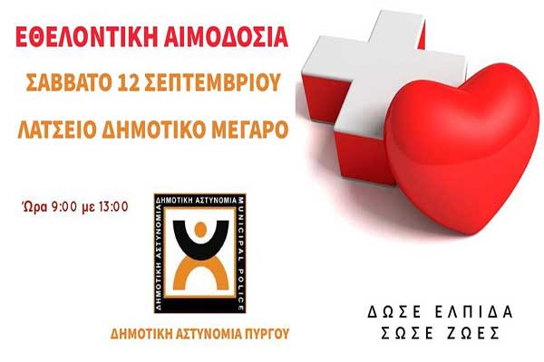 Δημοτική Αστυνομία Πύργου: Εθελοντική Αιμοδοσία το Σάββατο 12 Σεπτεμβρίου