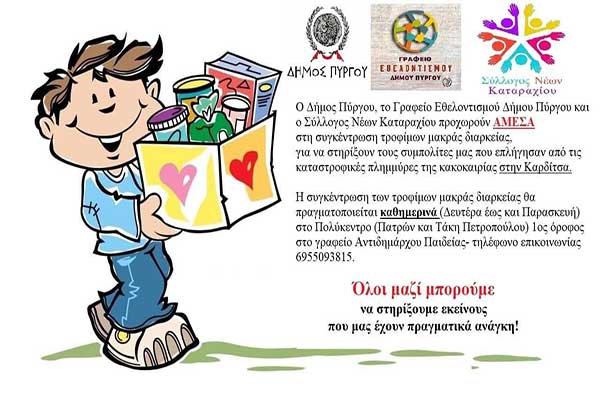 Δήμος Πύργου: Συγκέντρωση τροφίμων για τους πληγέντες της Καρδίτσας