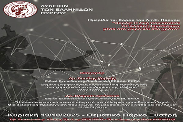 Λύκειο Ελληνίδων Πύργου: Την Κυριακή 19/10 η ημερίδα «Χορός: η ζωή που κινείται σε φόρμες βηματισμών μέσα στο χώρο και στο χρόνο»