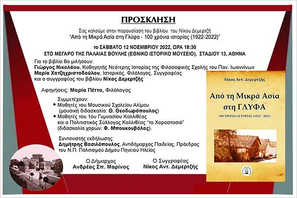 Δήμος Πηνειού: Παρουσίαση βιβλίου του Νίκου Δεμερτζή-«Από την Μικρά Ασία στη Γλύφα»