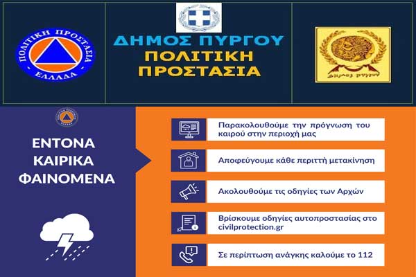 Πολιτική Προστασία Δήμου Ανδραβίδας-Κυλλήνης: Οδηγίες στους πολίτες για το Έκτακτο Δελτίο επικίνδυνων καιρικών φαινομένων