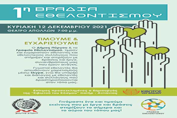 Δήμος Πύργου: 1η Βραδιά εθελοντισμού-Βραβεύεται η αγάπη στον συνάνθρωπο