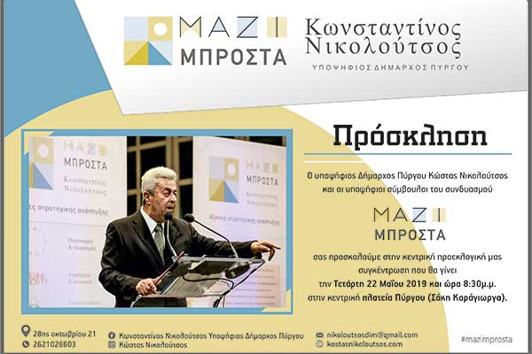 Κώστας Νικολούτσος-«ΜΑΖΙ ΜΠΡΟΣΤΑ»: Την Τετάρτη 22 Μαΐου η προεκλογική συγκέντρωση στην κεντρική Πλατεία Πύργου