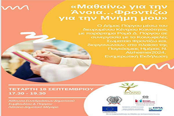 Δήμος Πύργου-Κοινωφελές Σωματείο «Φροντίζω»: Επιστημονική ημερίδα στο πλαίσιο της Παγκόσμιας Ημέρας νόσου Alzheimer