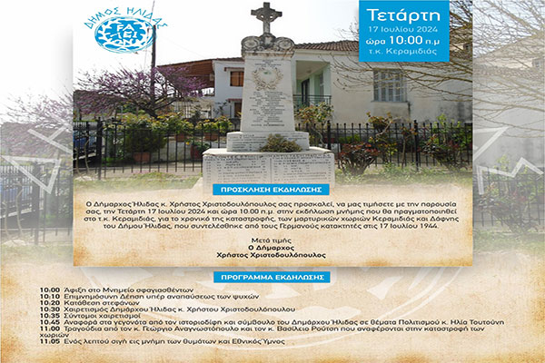 Δήμος Ήλιδας: Εκδήλωση μνήμης της Ναζιστικής θηριωδίας στην Τ.Κ. Κεραμιδιάς την Τετάρτη 17/7