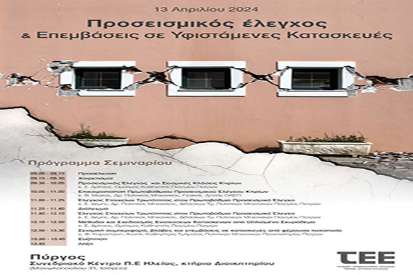 ΤΕΕ Δυτικής Ελλάδας: Σεμινάριο στον Πύργο για τον "Προσεισμικό Έλεγχο & Επεμβάσεις σε υφιστάμενες κατασκευές" στις 13/4