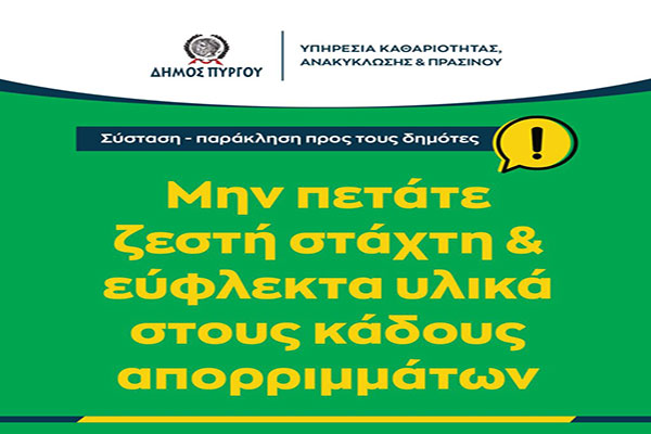 Δήμος Πύργου: Έκκληση από την Υπ. Καθαριότητας για τη μη ρίψη εύφλεκτων υλικών στους κάδους