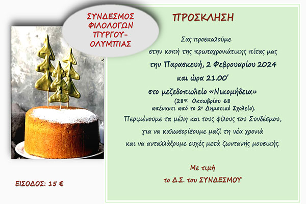 O Σύνδεσμος Φιλολόγων Πύργου-Ολυμπίας κόβει στις 2/2 την πρωτοχρονιάτικη πίτα του
