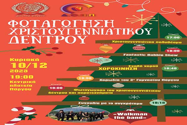 Πύργος: Η Φωταγώγηση του Χριστουγεννιάτικου Δένδρου στην κεντρική πλατεία της πόλης την Κυριακή 10/12