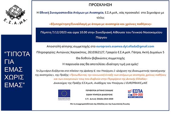 Ε.Σ.Α.μεΑ.: Στις 7/12 το Σεμινάριο "Εξυπηρέτηση - Συναλλαγή με άτομα με αναπηρία και χρόνιες παθήσεις" στον Πύργο