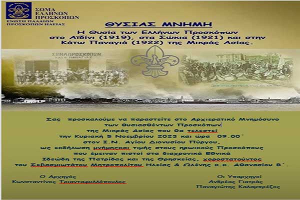 Ένωση Παλαιών Προσκόπων Ηλείας: Την Κυριακή 5/11 το Αρχιερατικό Μνημόσυνο προς τιμήν των Προσκόπων της Μικράς Ασίας στον Ι.Ν. Αγ.Διονυσίου Πύργου