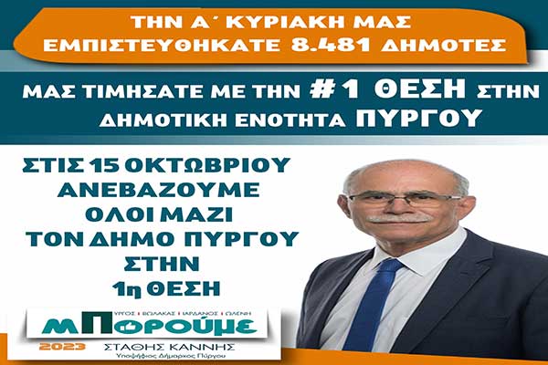 Στάθης Καννής - «ΜΠΟΡΟΥΜΕ»: "Στις 15 Οκτωβρίου ανεβάζουμε όλοι μαζί τον Δήμο Πύργου στην 1η θέση"