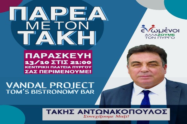 «Ενωμένοι Αλλάζουμε τον Πύργο»: "Παρέα με τον Τάκη" - 13/10 στην Κεντρική Πλατεία Πύργου