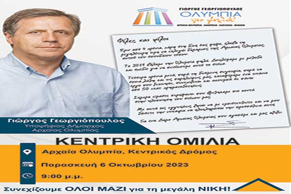 Απόψε Παρασκευή 6 Οκτωβρίου η κεντρική ομιλία Γεωργιόπουλου στην Αρχαία Ολυμπία