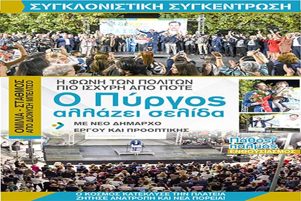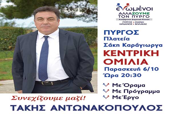 «Ενωμένοι αλλάζουμε τον Πύργο»: Την Παρασκευή (6/10) η ομιλία του Τάκη Αντωνακόπουλου στην κεντρική πλατεία Πύργου
