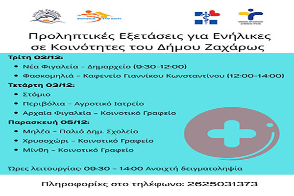 Προληπτικές Εξετάσεις για Ενήλικες Πολίτες σε Κοινότητες του Δήμου Ζαχάρως