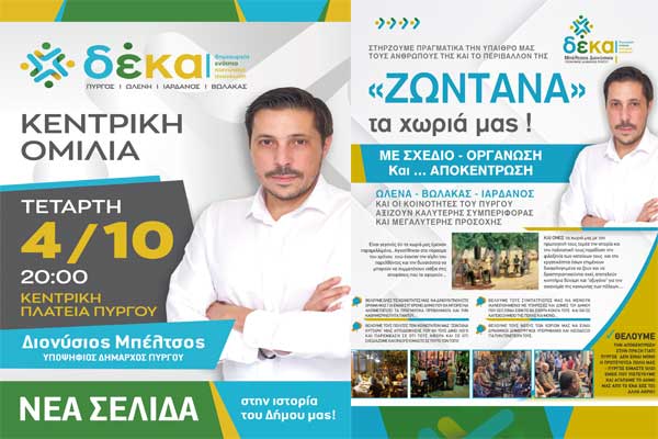 ΔΕΚΑ-Διον.Μπέλτσος: Στις 4/10 η κεντρική ομιλία στον Πύργο - «"Ζωντανά" τα χωριά μας!»