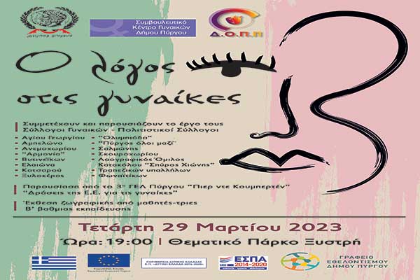 Δήμος Πύργου: “Ο λόγος στις γυναίκες” - Η εξ αναβολής εκδήλωση για την Ημέρα της Γυναίκας την Τετάρτη 29/3