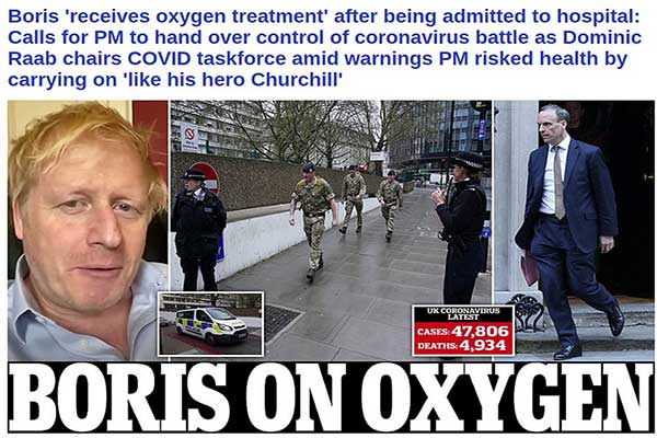 Σύμφωνα με την Daily Mail, ο βρετανός πρωθυπουργός που νοσηλεύεται στο νοσοκομείο St Thomas εκτιμάται ότι έβαλε σε κίνδυνο την υγεία του δουλεύοντας διαρκώς παρότι διαγνώστηκε θετικός στον κορωνοϊό. Ειδικοί εκτιμούν ότι υπάρχει κίνδυνος πνευμονίας αν ο πυρετός διαρκέσει πάνω από μια εβδομάδα.