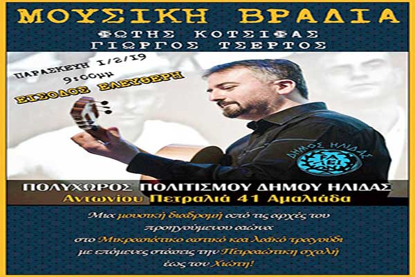 Αμαλιάδα: Ρεμπέτικη μουσική βραδιά με τους Φώτη Κότσιφα και Γιώργο Τσέρτο στον Πολυχώρο Πολιτισμού Δήμου Ήλιδας