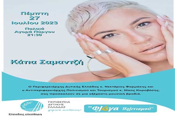 Συναυλία της Κάτιας Σαμαντζή την Πέμπτη το βράδυ στην Παλαιά Αγορά Πύργου από την Περιφέρεια Δυτικής Ελλάδας