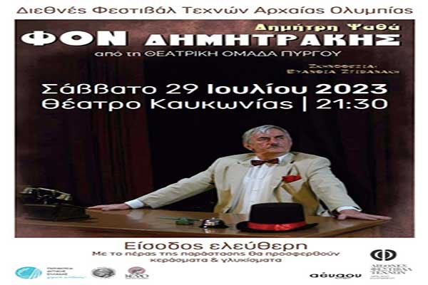 Διεθνές Φεστιβάλ Τεχνών Αρχαίας Ολυμπίας – ΘΕΑΤΡΙΚΗ ΟΜΑΔΑ ΠΥΡΓΟΥ: Ο «Φον Δημητράκης» του Δημήτρη Ψαθά στο θέατρο Καυκωνίας