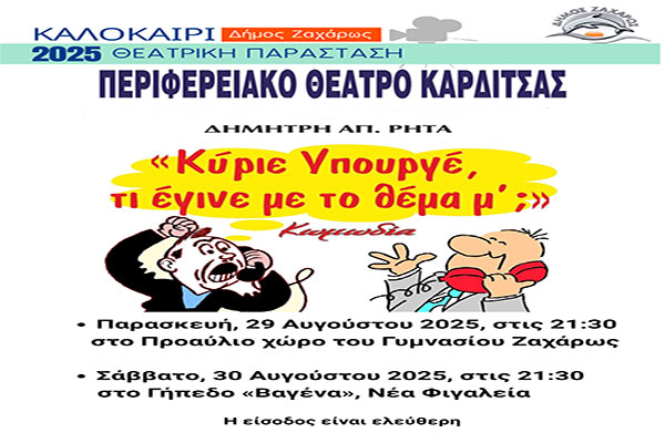 Δήμος Ζαχάρως: Στις 29 & 30 Αυγούστου η παράσταση «Κύριε Υπουργέ, τι έγινε με το θέμα μ';»