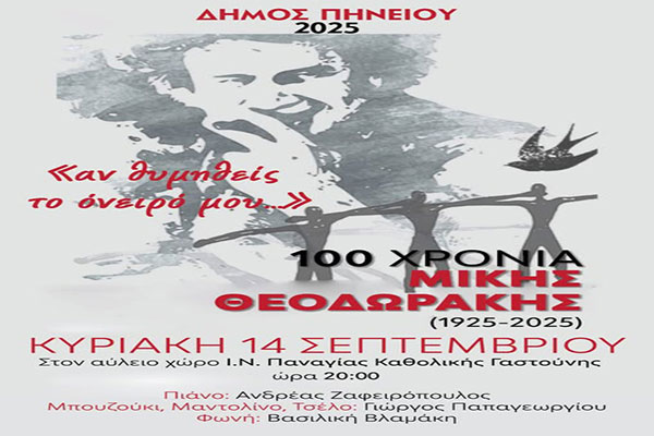 Δήμος Πηνειού: "Αν θυμηθείς το όνειρό μου…" - Συναυλία – Αφιέρωμα στον Μίκη Θεοδωράκη στον Προαύλιο Χώρο της Παναγίας Καθολικής Γαστούνης