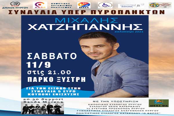 Δ. Πύργου: Συναυλία με τον Μιχάλη Χατζηγιάννη για την ενίσχυση των πυρόπληκτων (11/9) - Οδηγίες προς τους θεατές