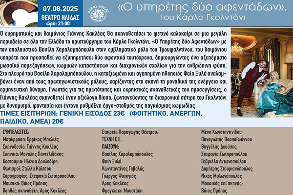 35ο Διεθνές Φεστιβάλ Αρχαίας Ήλιδας: Το έργο «Υπηρέτης δύο αφεντάδων» με τον μοναδικό Βασίλη Χαραλαμπόπουλο έρχεται στο Θέατρο της Αρχαίας Ήλιδας
