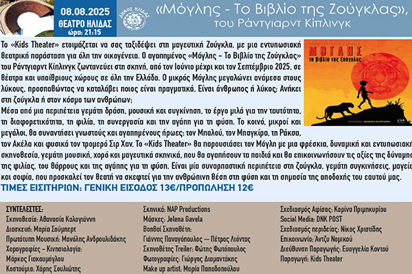 Ο Μόγλης ζωντανεύει στην θεατρική του ζούγκλα, σε μια μαγευτική παιδική παράσταση στο πλαίσιο του 35ου Φεστιβάλ Αρχαίας Ήλιδας