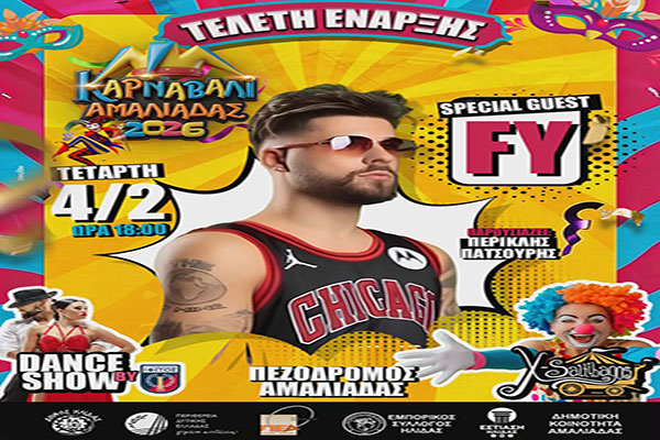 18:00 Τελετή Έναρξης «9ο Καρναβάλι Αμαλιάδας», με συναυλία FY – Πεζόδρομος Αμαλιάδας