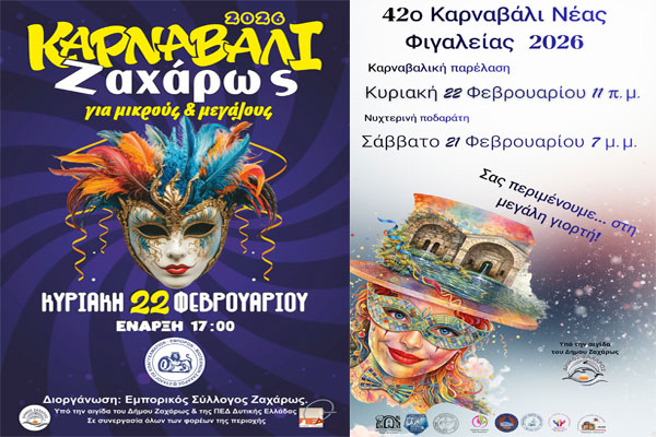 Ο Εμπορικός Σύλλογος Ζαχάρως , σε συνεργασία με τους Πολιτιστικούς Συλλόγους, τους Συλλόγους Γονέων και Κηδεμόνων των Σχολικών Μονάδων, τους Τοπικούς Φορείς και τους Εθελοντές, υπό την αιγίδα και με την υποστήριξη του Δήμου Ζαχάρως και της Π.Ε.Δ.Δ.Ε., προσκαλούν μικρούς και μεγάλους να συμμετάσχουν στις Αποκριάτικες Εκδηλώσεις 2026 που κορυφώνονται τις επόμενες ημέρες σε Ζαχάρω και Νέα Φιγαλεία.