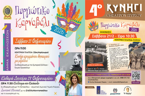 Πυργιώτικο Καρναβάλι 2026: Το Σάββατο το Κυνήγι του Κρυμμένου Θησαυρού και πάρτι με τη Ράνια Κωστάκη