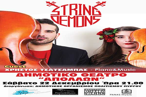 Πολιτισμού Πύργου παρουσιάζει το Σάββατο 22 Δεκεμβρίου 2018 και ώρα 21.00, στο Δημοτικό Θέατρο «ΑΠΟΛΛΩΝ» Πύργου, μουσική συναυλία των “STRING DEMONS”, με δωρεάν είσοδο για το κοινό.