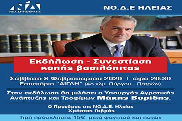 ΝΟΔΕ Ηλείας: Παρουσία του Μάκη Βορίδη η κοπή της πρωτοχρονιάτικης πίτας το Σάββατο