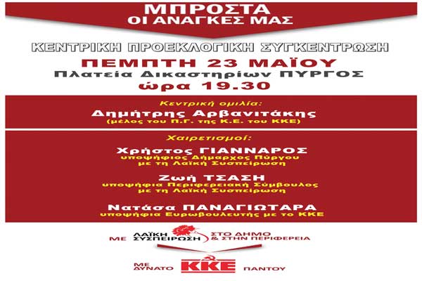 Πύργος: Σήμερα η κεντρική ομιλία της Λαϊκής Συσπείρωσης στην Πλατεία Δικαστηρίων