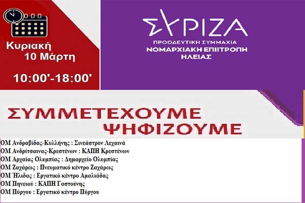 Εκλογές για τη νέα Νομαρχιακή επιτροπή ΣΥΡΙΖΑ ΠΣ ΗΛΕΙΑΣ
