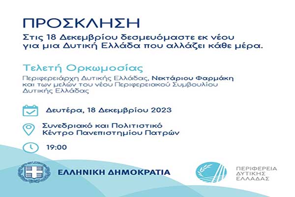 Την ερχόμενη Δευτέρα η ορκωμοσία του Περιφερειάρχη Ν. Φαρμάκη και των μελών του Περιφερειακού Συμβουλίου Δυτικής Ελλάδας