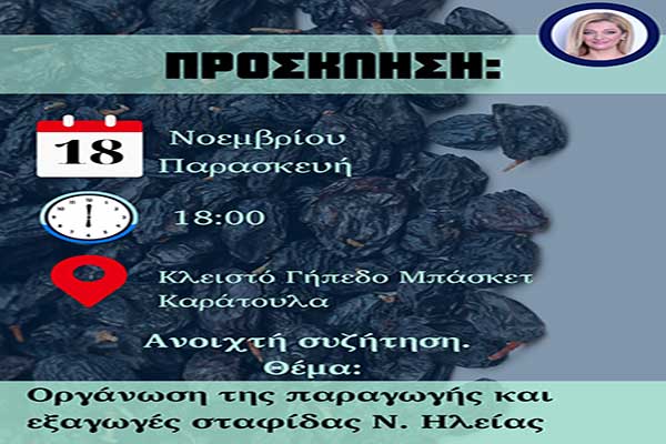 Αυγερινοπούλου: Δεύτερη ανοιχτή συζήτηση για την οργάνωση της παραγωγής και της εξαγωγής σταφίδας του Ν. Ηλείας στο Καράτουλα
