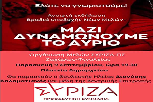 ΣΥΡΙΖΑ Ηλείας: Ανοιχτή εκδήλωση σήμερα Παρασκευή στην Πλατεία του Δημαρχείου Ζαχάρως